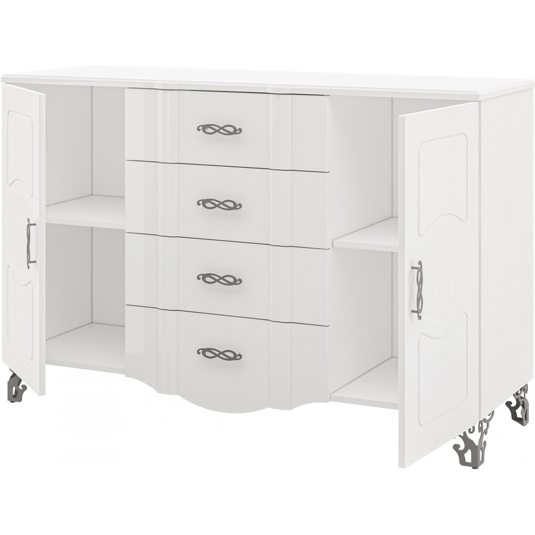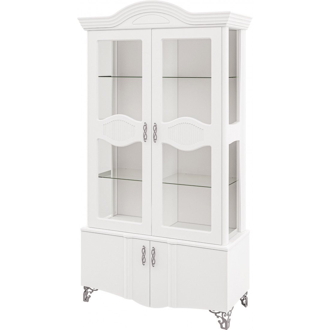 Дизайн гостиной поражает лаконичностью и изяществом. Эффектности ему придает и практические идентичное воспроизведение очертаний узора на гравировке на фигурных хромированных ручках и ножках, фрезеровке по карнизу шкафов-витрин. Купить гостиную София – добавить ощущение сдержанной роскоши в интерьерное решение гостиной.