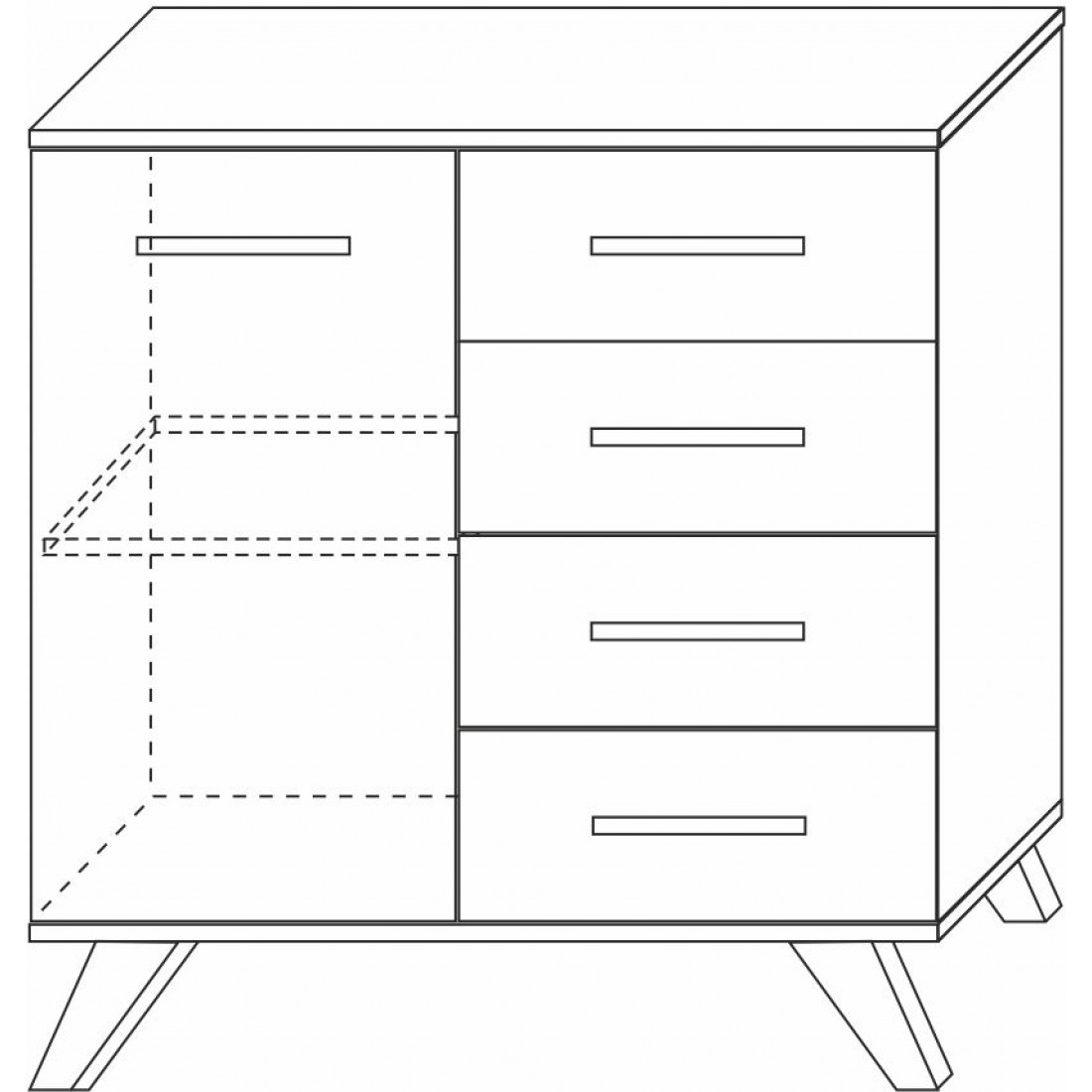 - 4 выдвижных ящика и 1 отделение с распашной дверцей: