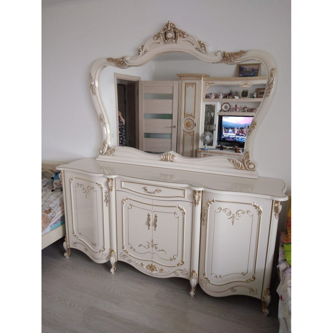 Комод для посуды с зеркалом Элиза (беж) – данная модель сделает вашу гостиную неповторимой и придаст ей богатую атмосферу. Он имеет четыре дверцы за которыми скрываются большие вместительные полки, что с легкостью поможет вам хранить все необходимые вещи. По середине есть не большая вытягивающаяся полка, которая по бокам имеет две ручки в виде кнопки. Комод «Аллегро» идет в комплекте с большим зеркалом которое украшено резной вставкой в сочетании с тонкой росписью, что подчеркнет классический стиль и послужит показателем богатства и престижа хозяев дома.