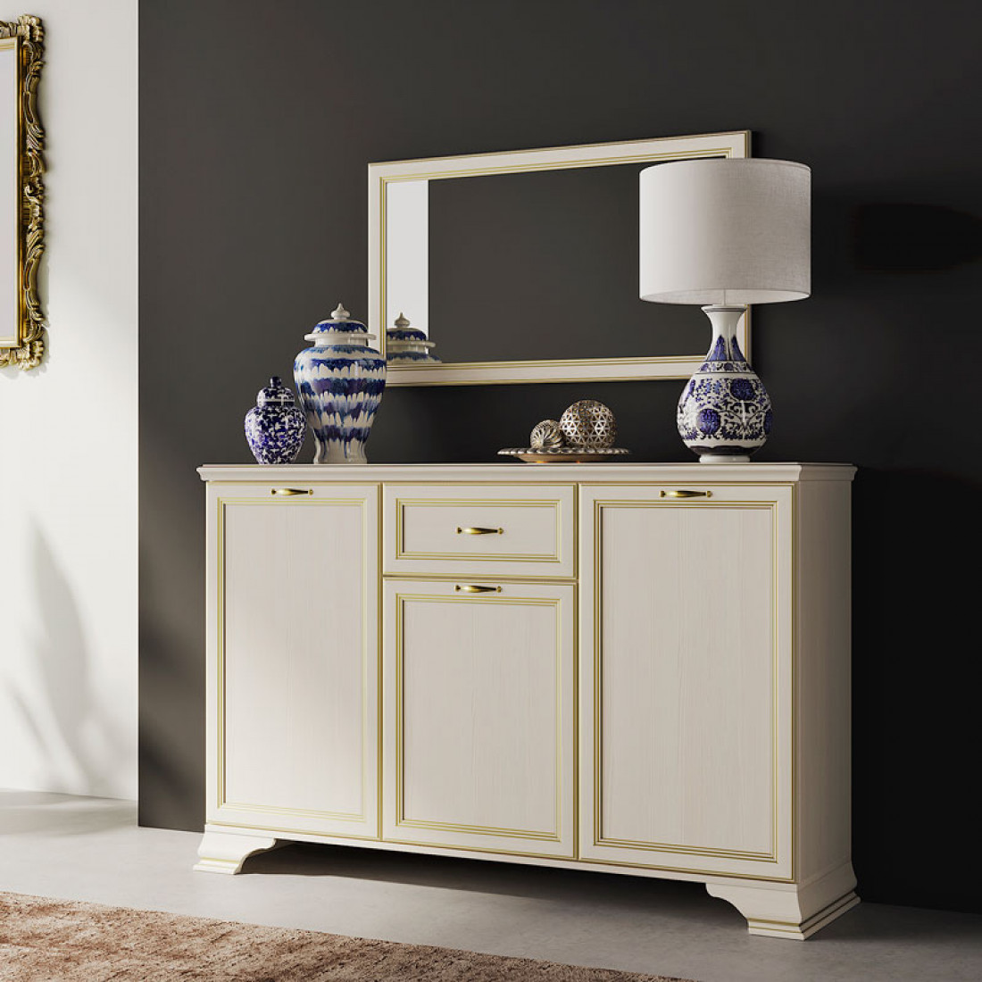Коллекция производится в текстуре «бодега белый» с эффектом золотого патинирования. Облик «Сиены» дополняют рамочные фасады и карниз в классическом стиле, а также эффектные опоры из МДФ. Мебель комплектуются металлической лицевой фурнитурой премиум-класса в цвете «старая бронза» и надежной крепежной фурнитурой.
