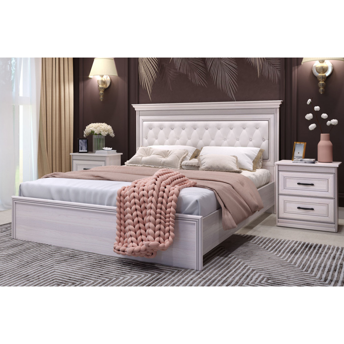 Спальня Неаполь 2 Ясень анкор светлый (патина "серебро") экокожа «polo» белая.