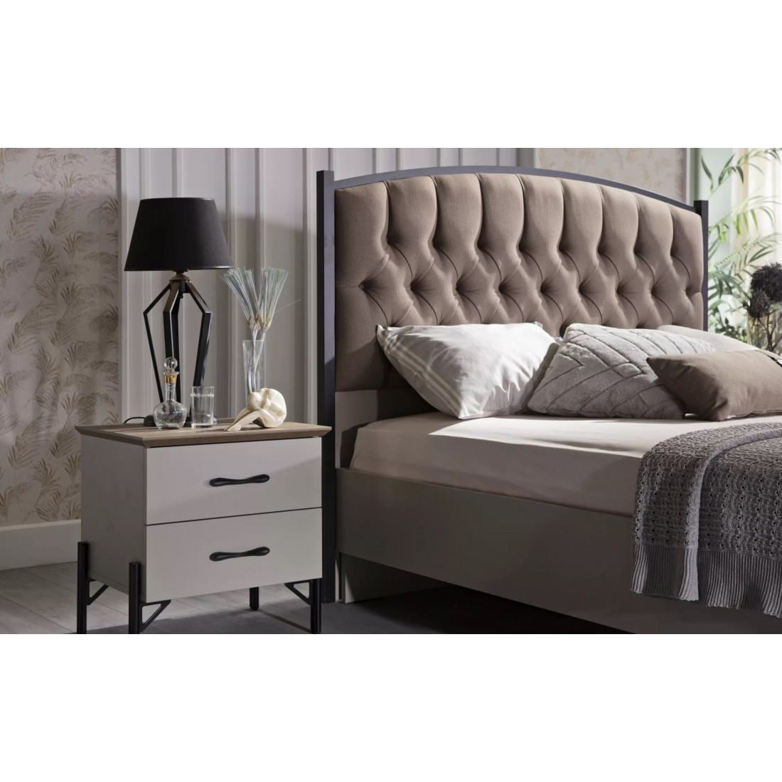 Кровать "Палвин" выполнена в светлых тонах коллекции. Светлое основание с металлическими ножками и мягкой центральной частью на спинке освежат вашу спальню на 100%.