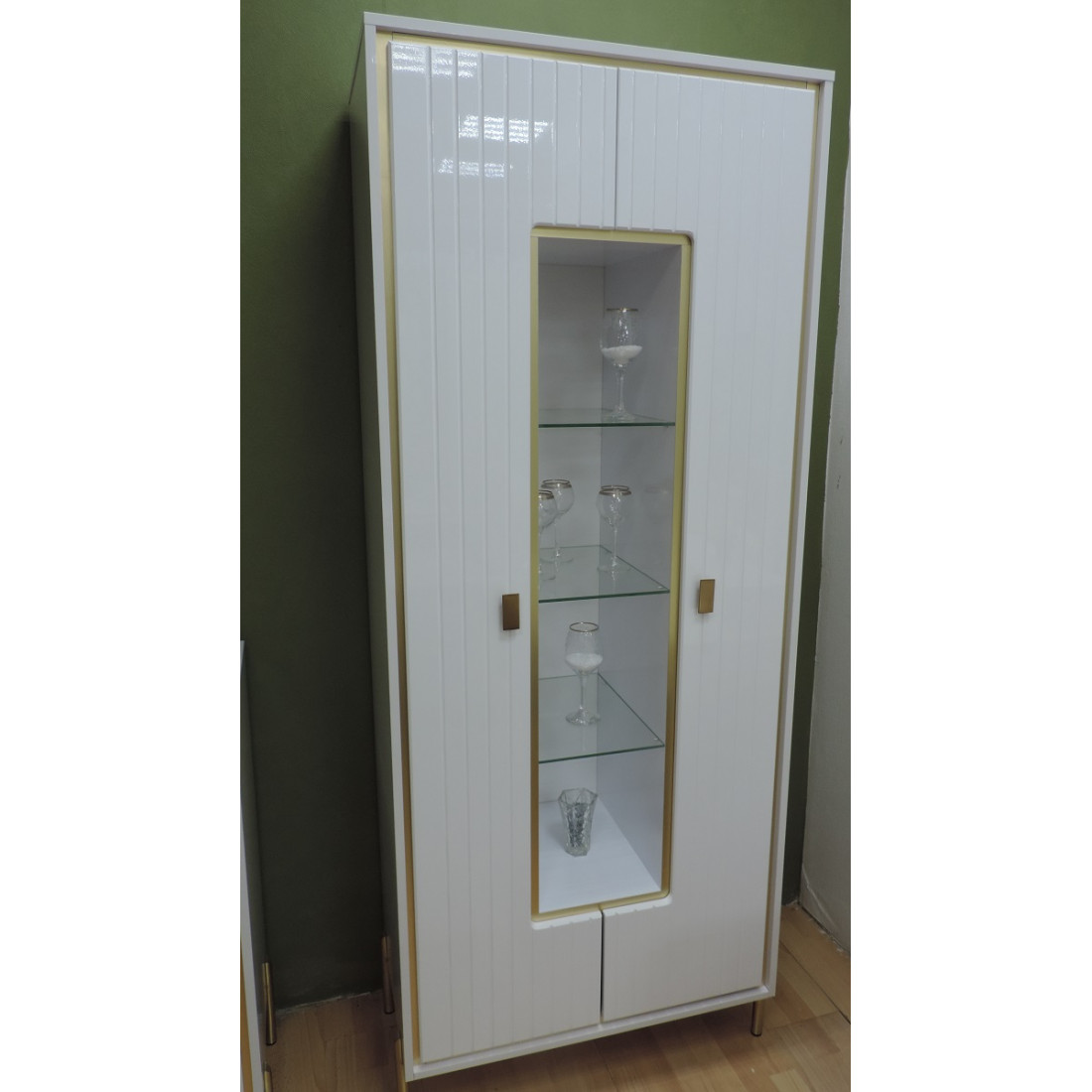 Стеклянные полки за прозрачной стеклянной дверцей можно дополнить подсветкой.