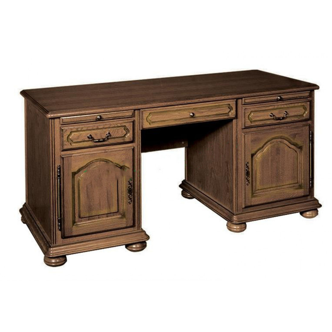 Классический письменный стол с двумя тумбами из коллекции мебели из массива дуба "Давиль" станет прекрасным дополнением интерьера гостиной или кабинета. Площадь столешницы можно увеличить за счет выдвижных полок. Внутри левой тумбы также есть выдвижные полки и ящик, в правой - полка для системного блока. Выполнен в цвете "Медовый дуб с золотой патиной".