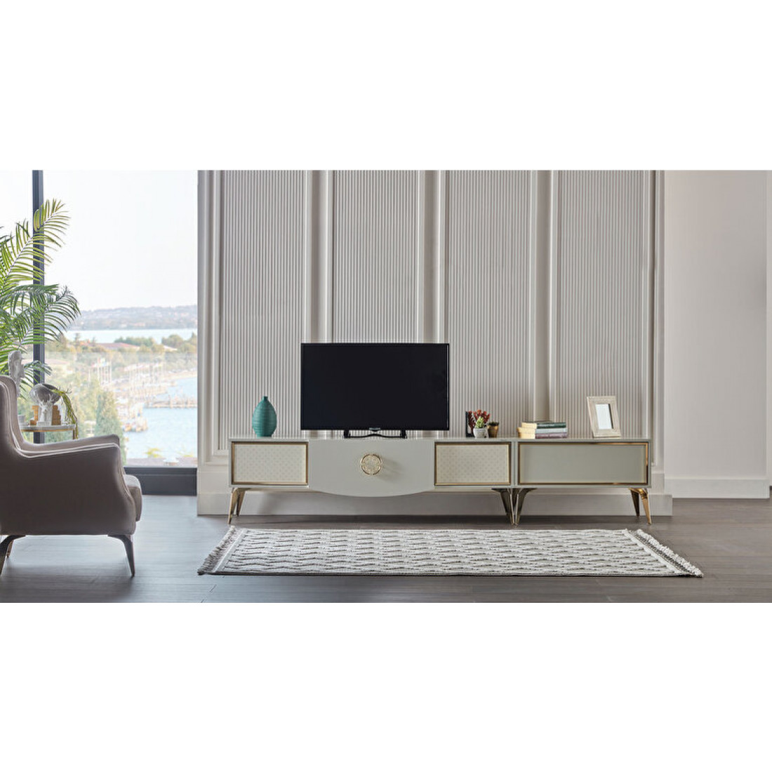 Тумба под ТВ Валеско с рисунком в стиле АРТ-ДЕКО, золотисто-желтыми фитилями, металлическими ручками,ножками