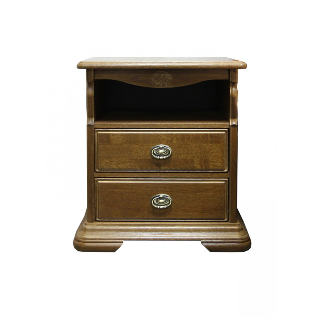 Прикроватная тумба Лика, оснащенная двумя ящиками и нишей, изготовлена из массива и шпона дуба в цвете "Медовый дуб с золотой патиной". Производитель – белорусская фабрика «Молодечномебель»