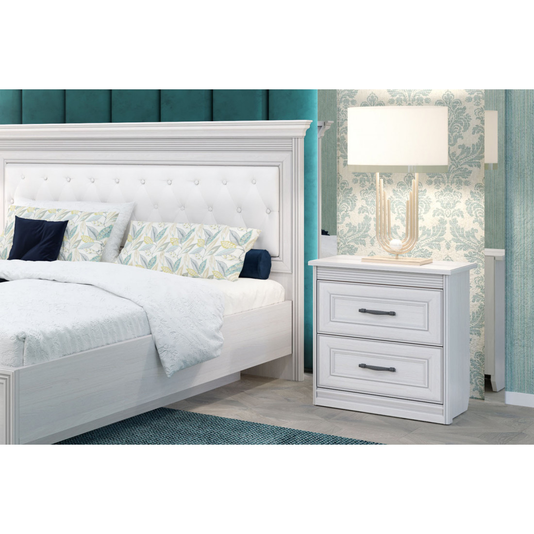 Спальня Неаполь 2 Ясень анкор светлый (патина "серебро") экокожа «polo» белая.