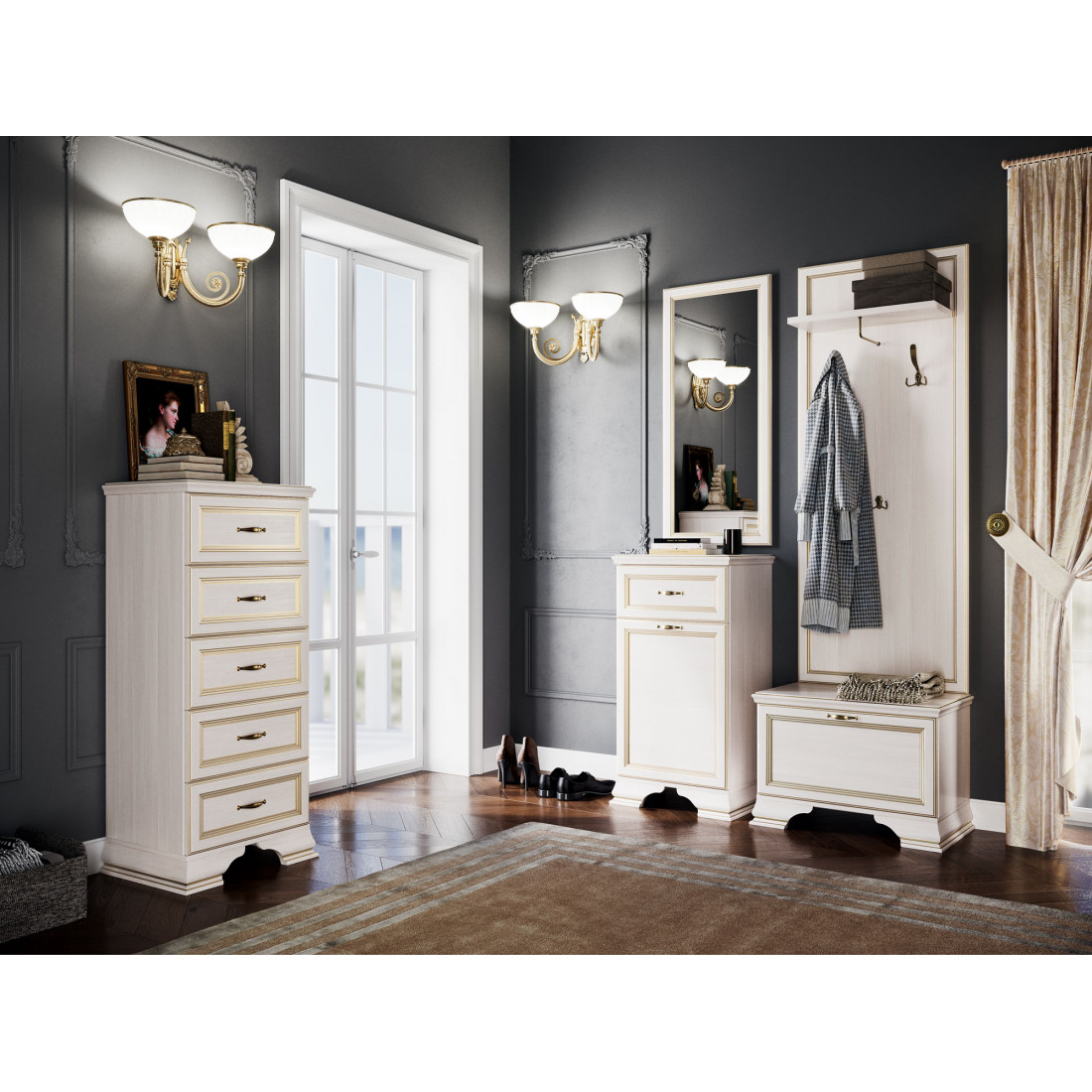 Коллекция производится в текстуре «бодега белый» с эффектом золотого патинирования. Облик «Сиены» дополняют рамочные фасады и карниз в классическом стиле, а также эффектные опоры из МДФ. Мебель комплектуются металлической лицевой фурнитурой премиум-класса в цвете «старая бронза» и надежной крепежной фурнитурой.